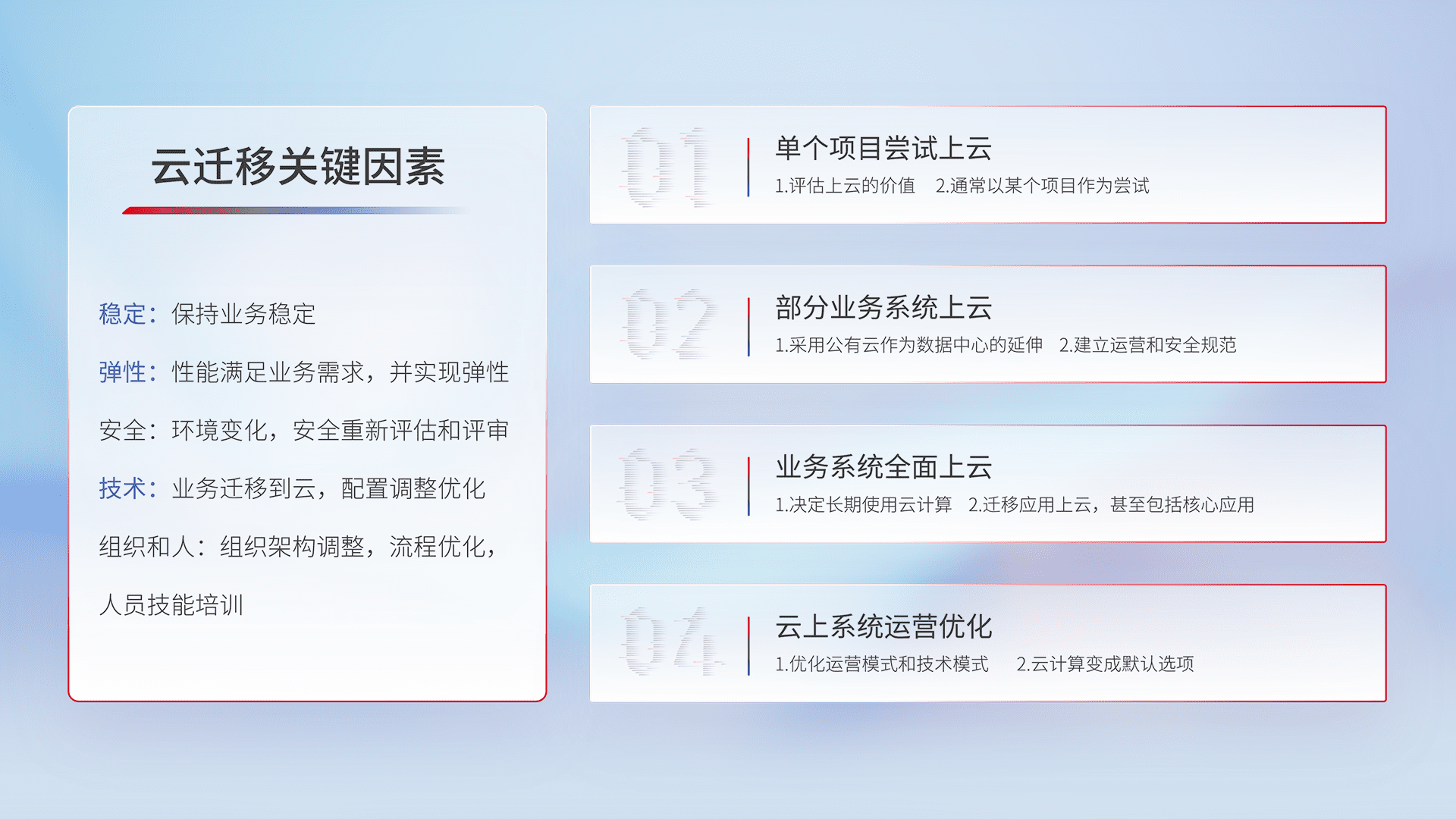 结合实际业务,,从规划设计、、云平台选型、、云原生改造、、数据迁移、、、集成交付,,迁移全过程为客户识别最佳上云路径,,做好风险识别管理,,设计网络架构、、、、身份权限、、、安全审计合规、、、、操作审计、、、日志审计、、、、监控告警策略、、、、多站点容灾设计等,,对云上基础设施进行整体规划,,,提升IT治理水平,,,以满足弹性、、、高可用、、、高性能的需求。。